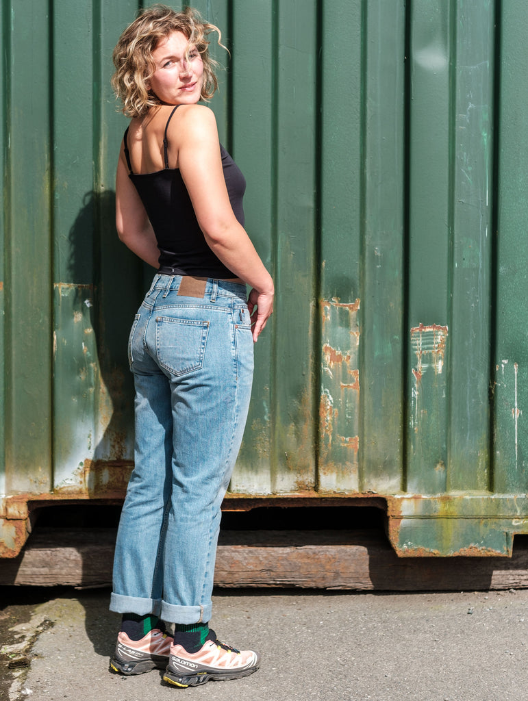 If you're a denim geek, you'll know that traditionally a twill is woven either to the right hand or the left hand, which can cause tension in the fabric. It's that tension which can make the outside seam of a regular jean twist around to the front or back, after it's washed.